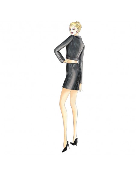 This skirt has an insert at the back made of fabric cut on the bias and which opens at the back in unironed pleats. Also recommendable in a shorter version. Suggested fabric: pin-stripe. Jacket n. 1506.
