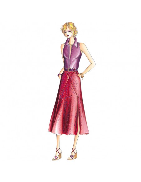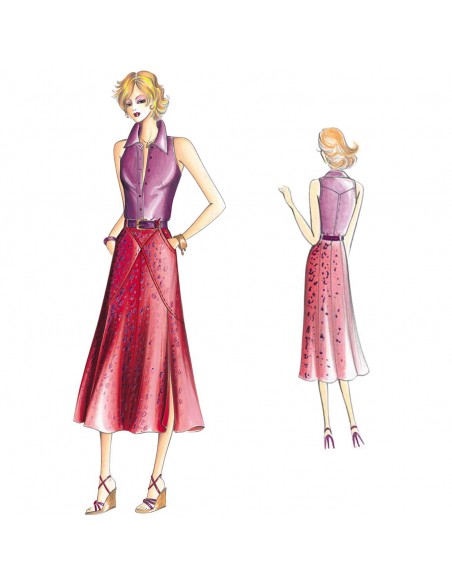 This long flared skirt has eight panels with double slits. It has a crossed cut motif at the front and parallel French-cut pockets. Suggested fabric: denim, linen, poplin, sateen, cotton gabardine.