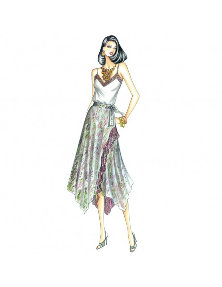 Folk-hippy flair for this broad asymmetrical skirt with scarf-like panels and ruffle running in an arched cut. A vent is inserted in the center of the back. Suggested fabric: muslin, sateen or washed silk with ruffle and vent in Chantilly lace.
