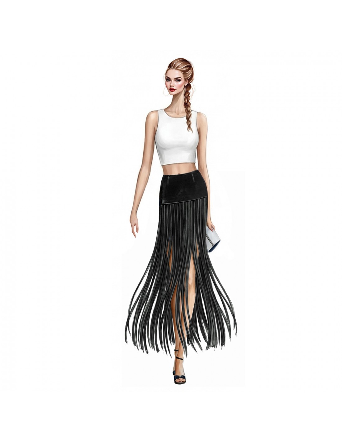 Skirt to be made in faux leather or crepe, in various versions: with a sash tied at the side, in both smooth and pleated versions; with decorative ribbon at hip level; or with a smooth basque and applied fringes.