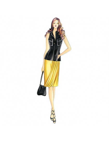 This straight skirt has a transverse panel. Suggested fabric: linen or crêpe with panel in voile or jersey. Waistcoat n. 9055.