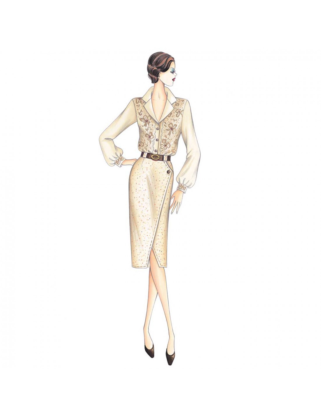 This straight skirt has crossed panels cut diagonally and which open at the bottom. It has a single pocket. Suggested fabric: tweed, gabardine, crêpe. Blouse n. 8496.