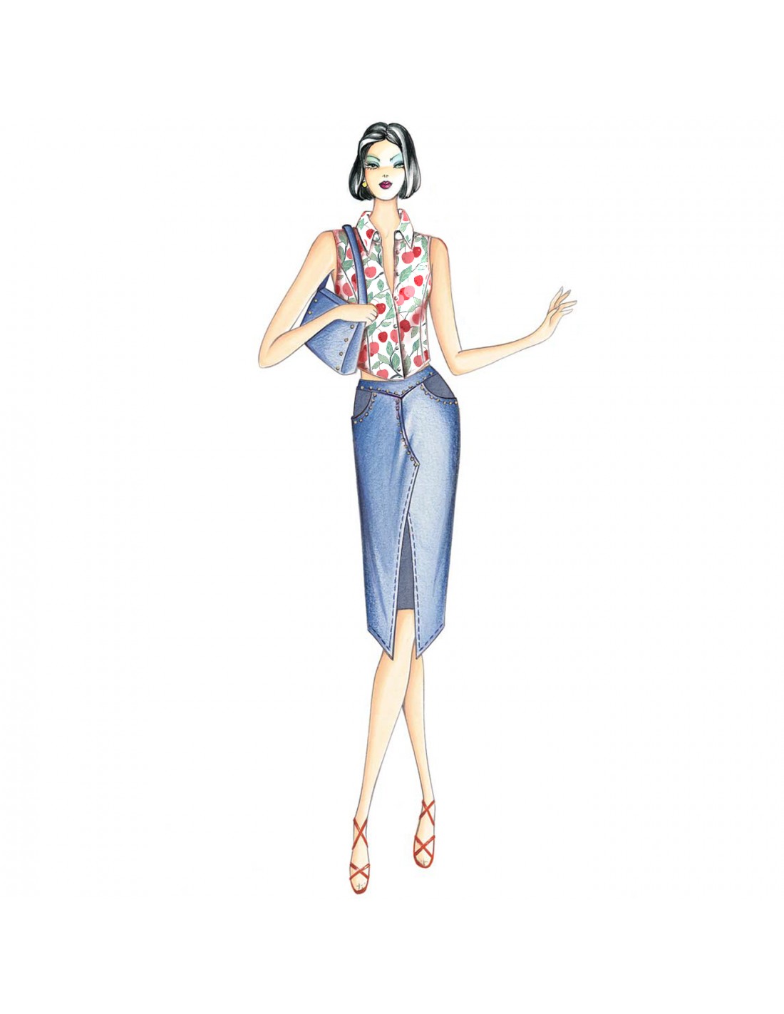 This form-fitting top has a rounded hemline and a shirt-like collar. Skirt n. 8293.
