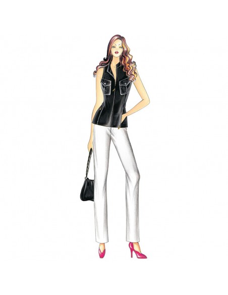 This long waistcoat has inset armholes. It has a strip collar and zippers on the pockets, closure and back. Suggested fabric: gabardine, linen, denim or batiste. Trousers n. 5182. Skirt . 9056.