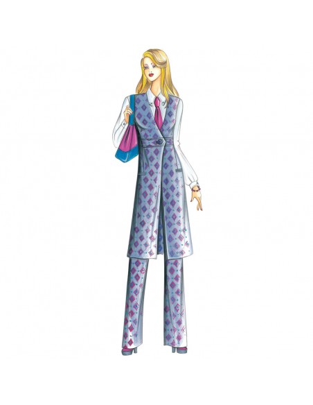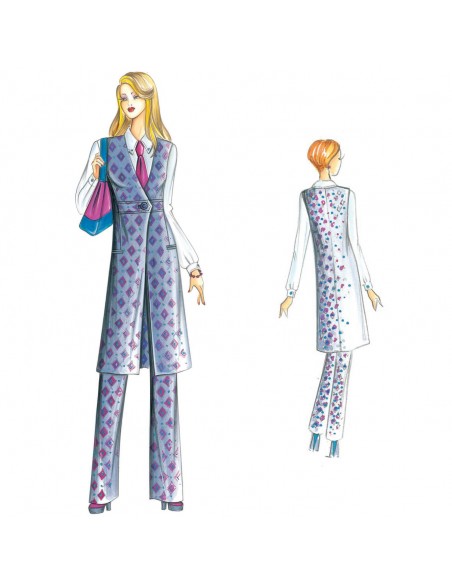 Long ‘70s style vest. Suggested fabric: wool crêpe and tie-pattern silk. Straight-cut pants n° 3110.