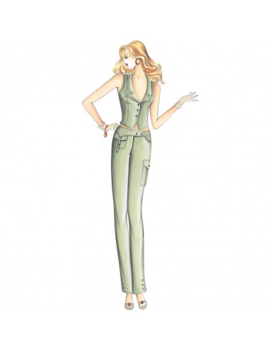 This single-breasted, form-fitting, men’s-style waistcoat has an opening at the bottom, strip pockets and V-neckline adorned with lace ruches. Jacket n. 8454.