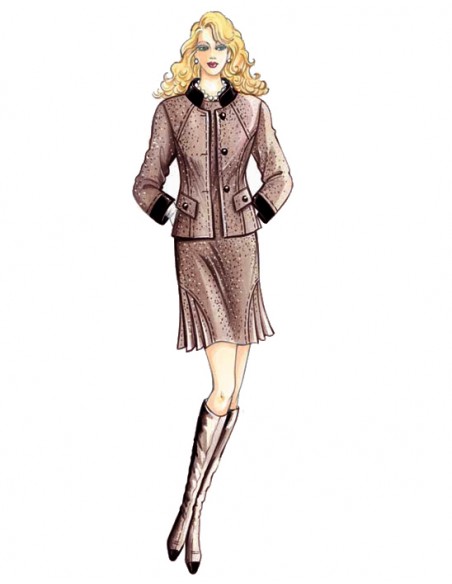 This single-breasted, form-fitting jacket has a Korean collar, oblique yoke and inset pockets with oblique flaps secured with buttons. Suggested fabric: tweed with velvet collar and cuffs. To combine with the dress 0742.