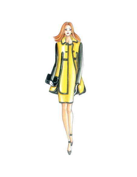 Long, flared single-breasted jacket with shirt-style collar, and longitudinal seams ending in rounded slits at the hem. Suggested fabric: brushed wool or tweed, with or without leather piping.