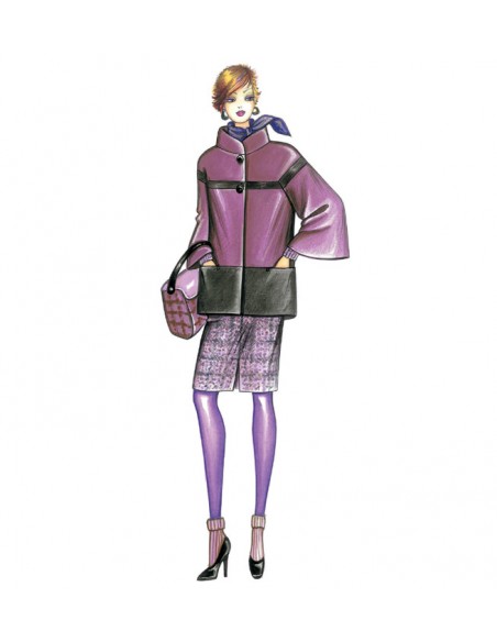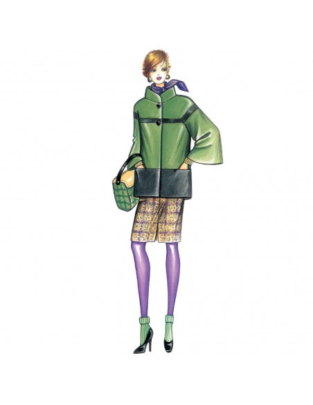 Single-breasted slightly flared winter jacket with crew neck, yoke that joins set-in sleeves, flared ¾-length sleeves, and pouch pockets. Suggested fabric: twotone flannel, velour with black leather trim, or quiloted fabric.