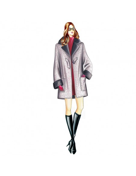 This straight, single-breasted jacket is closed with a belt. It has sleeves with armholes which are rounded at the front and raglan style at the back. It has patch pockets, a broad sporty collar and turned up felt or velvet cuffs. Suggested fabric: tweed double cashmere or treated wool.
