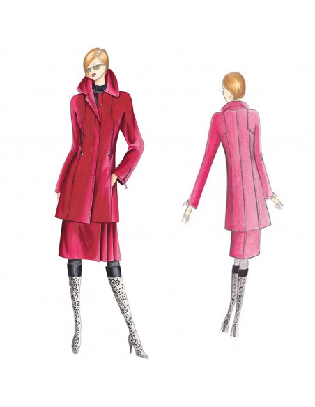 This form-fitting jacket closes with hidden hooks. It has a riding-coat cut with inserted strip pockets which are closed by zippers. The sleeves have rectangular armholes and strip cuffs. Suggested fabric: gabardine, smeared or water-proofed techno fabric. Skirt n. 8436.