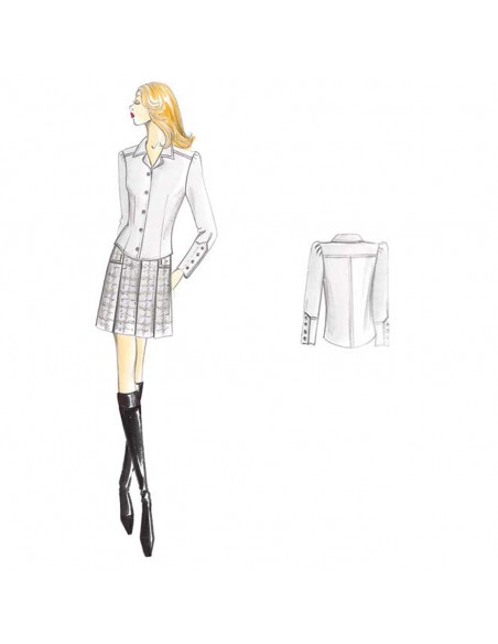This form-fitting blouse has sleeves that are gathered at the shoulders and which have wide cuffs secured with buttons. Suggested fabric: satin or taffeta. Skirt n. 1486.
