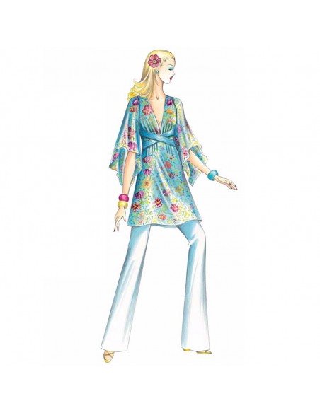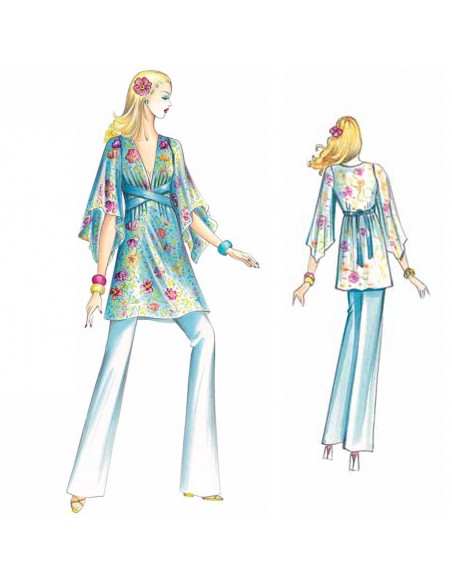 Casaca larga y acampanada tipo hippie, cintas cruzadas sobre el corte imperio, mangas originales en forma de campana y dobladillo en punta. Se puede hacer de chifón, satén, muselina o gasa de algodón.