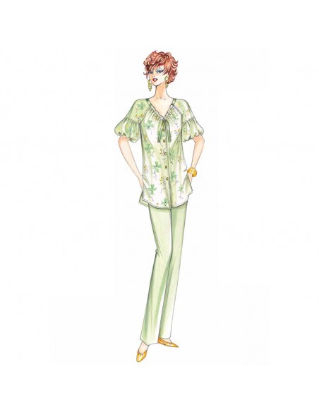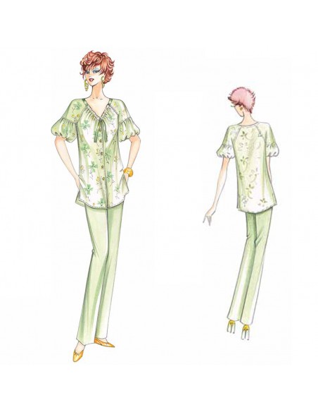 Blusa romántica de línea recta, una cinta perfila el escote y forma un fruncido tipo coulisse, mangas ranglán abombadas. Se puede hacer de muselina o gasa de algodón, sank gallen, satén.