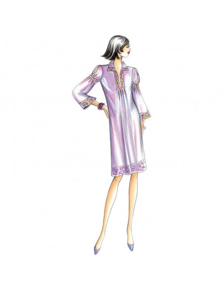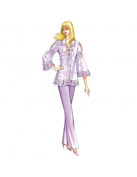 Casaca estilo étnico, para hacer en muselina con diseños tipo foulard, cierre de cuello con cordón, suelta en el centro por delante y mangas con abertura sobre los hombros. Se puede hacer también en versión camisa grande y con bordados en lentejuelas y perlitas.