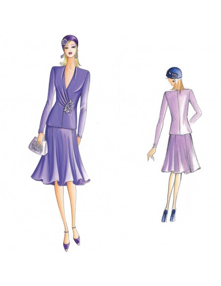 Casaca de línea semi-modelada, pinzas sueltas en el escote V, una aplicación de encaje bordado adorna el drapeado del corpiño. Falda n. 1936.