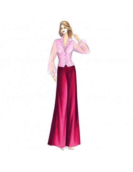 Pequeña casaca elegante, modelada, se puede hacer en adamascado o en pana, de una sola fila de botones y abierta en la parte inferior, cuello camisa y mangas de chifón con puños fruncidos. Pantalones n. 5107. Chifón