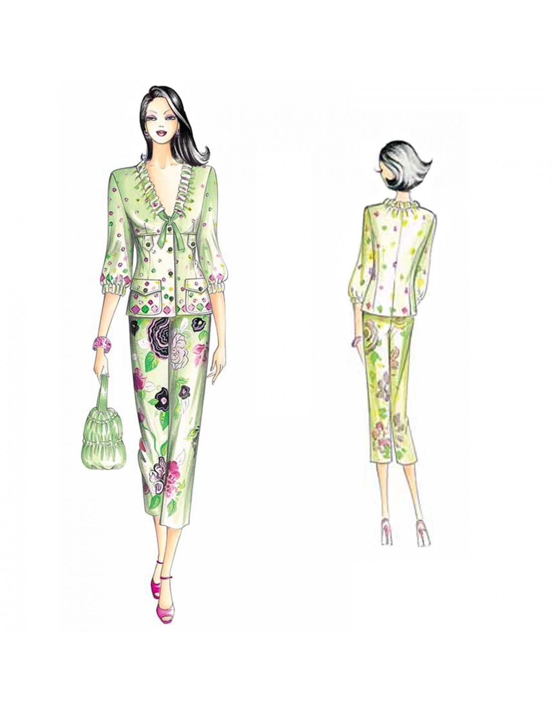 Blusa de línea modelada y corte imperio donde se insertan bolsillos parcheados y tiras, cuello fruncido con cinta de paso, bolsillos de parche y mangas 3/4 fruncidas en los puños. Se puede hacer en chifón, lino, punto, muselina de algodón.