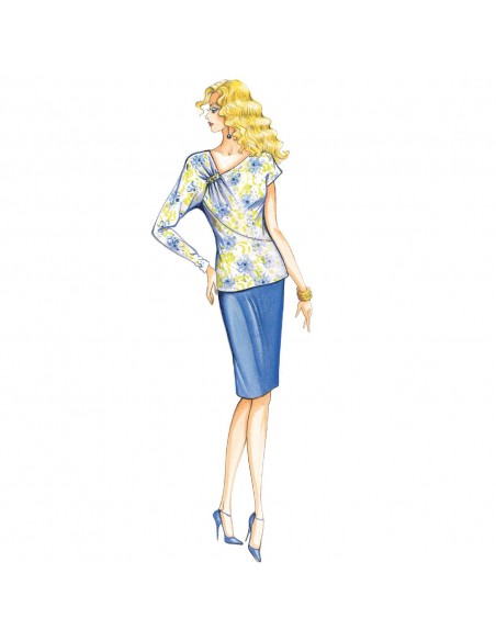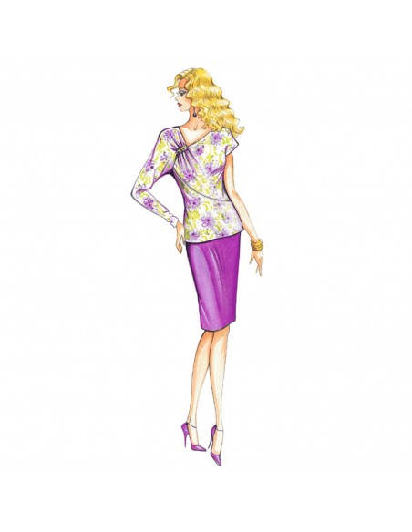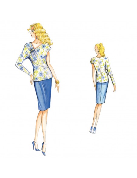 Casaca elegante, modelada, de cortes asimétricos, manga larga y única tipo kimono, con corte raglán para formar drapeado en el escote. Tejido recomendable punto ligero de viscosa o muselina.