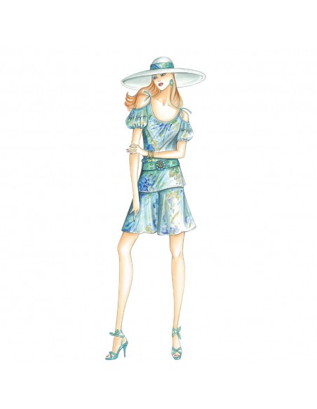 Blusa amplia, deja los hombros descubiertos, escote redondo y mangas abombadas cortadas para converger en pequeñas tirantas anudadas, realizable en muselina de algodón, organdí, georgette.