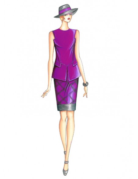 Casaca ajustada, de cuello barco, con vuelta entrante y corte geométrico, corte en V de talle bajo donde se insertan el faldellín, de abertura central, y las solapas. Tejidos recomendados: lino, encaje, tweed, lana fría, crespón.