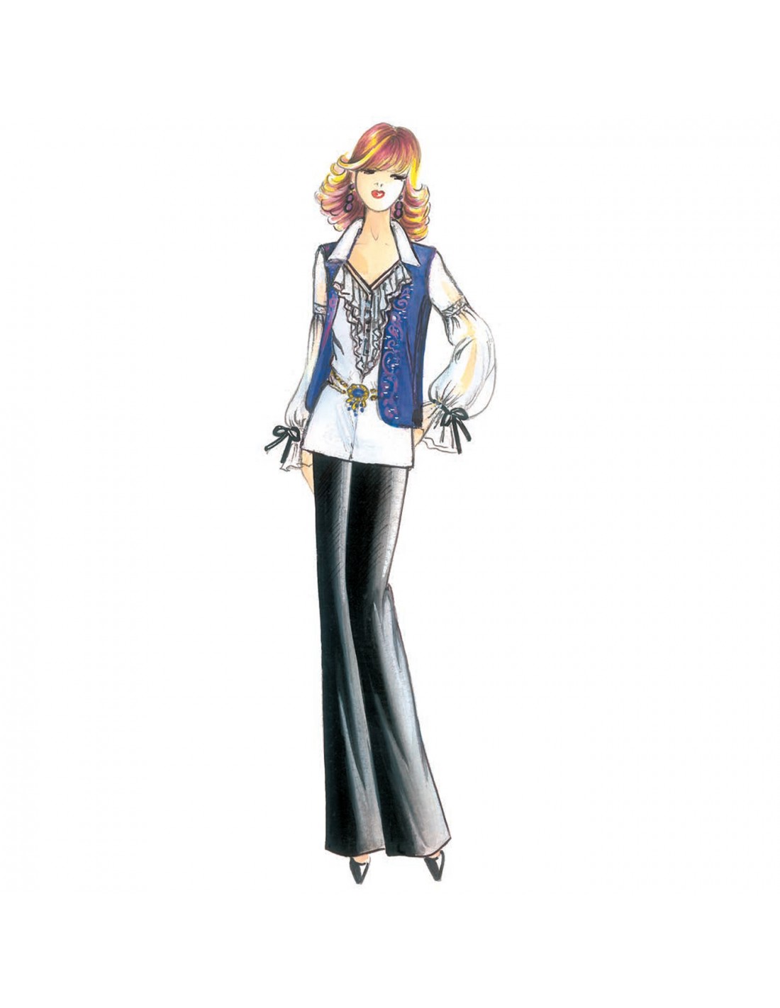 Blusa romántica, recomendable en chifón o muselina de algodón, escote corazón con dobles volantes. Realizable tambiécon con cuello de puntas bajadas esticlo camisa. Chaleco n. 5163.