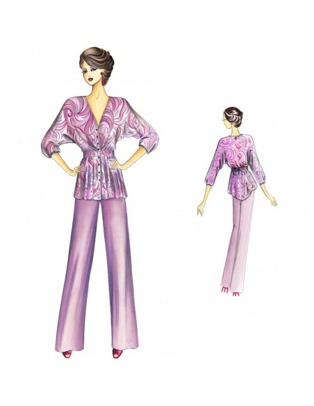 Blusa con mangas kimono 3/4, escote V y franja en la cintura para sujetar el faldellín suelto. Se puede hacer de jersey, gasa o crepé de chiné.