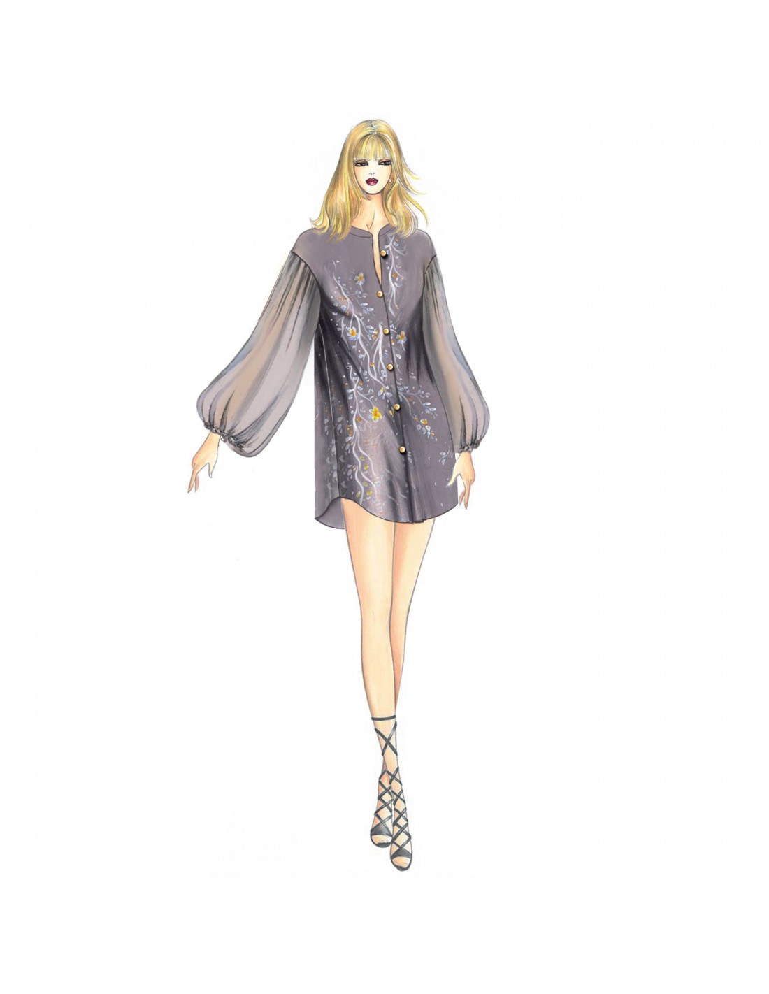 Suave túnica semirrecta con mangas anchas fruncidas, dobladillo redondeado en el lateral y cuello con banda. Recomendada en muselina, organza o algodón viscosa.