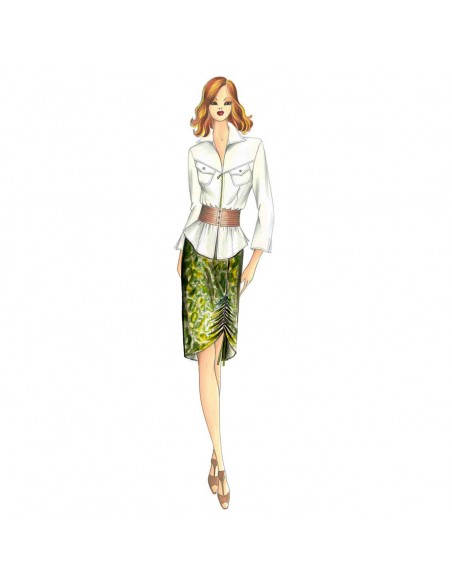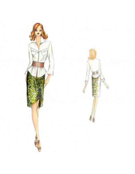 Blusa semi-modelada, se abrocha con cremallera, cuello alargado de puntas, solapas aplicadas al canesú y mangas 3/4 con pequeña abertura. Falda n. 9093. Pantalones n. 6930.