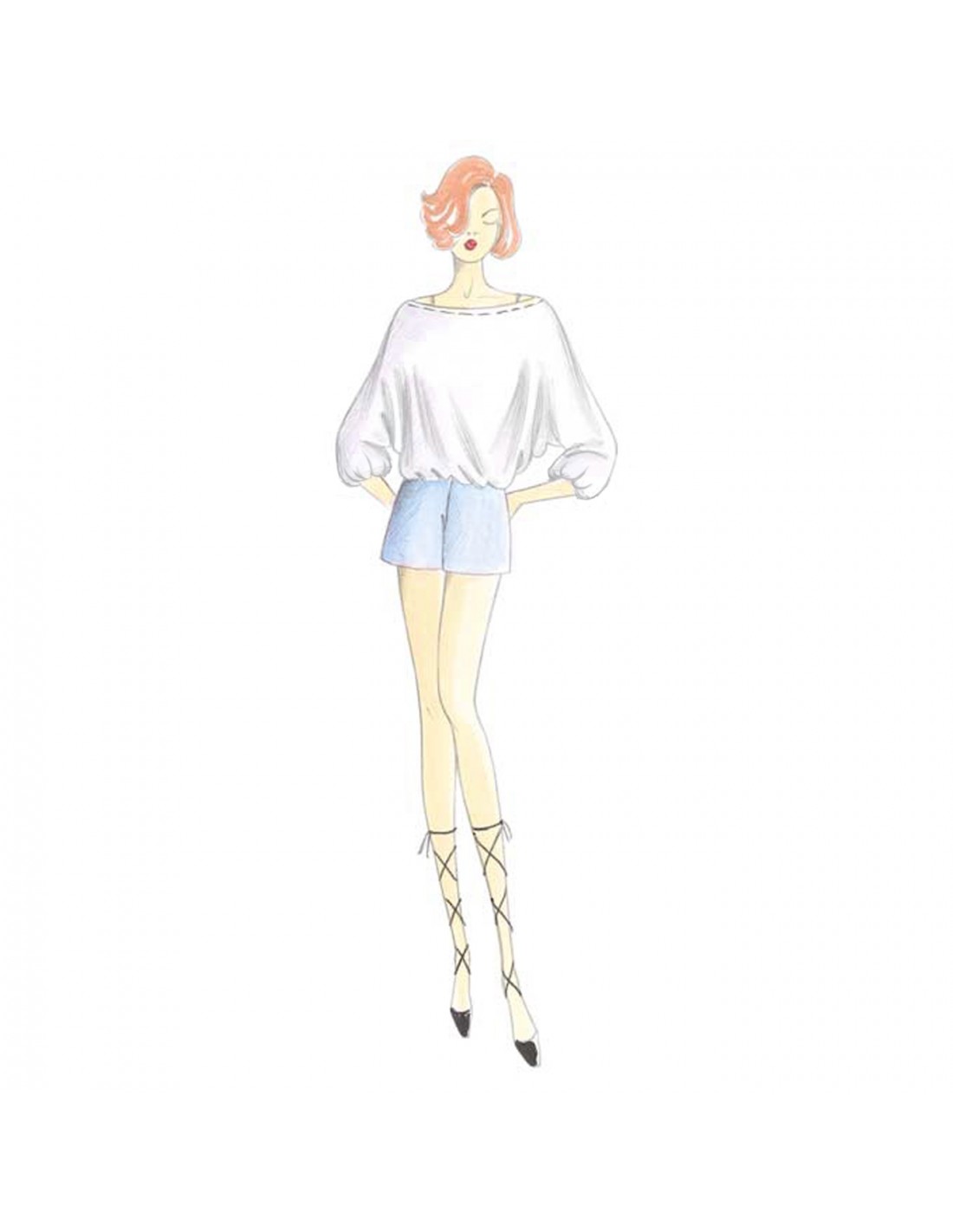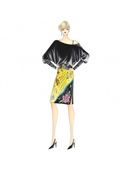 Blusa que descubre los hombros, se puede hacer en chifón, punto u otro tejido suave, mangas anchas quimono con puños anchos serpentinos, la parte trasera lleva un amplio escote y cordones. Falda recta y simple, en este caso con abertura lateral, n. 5045. Pantalones cortos n. 8668. Pantalones n. 1775.