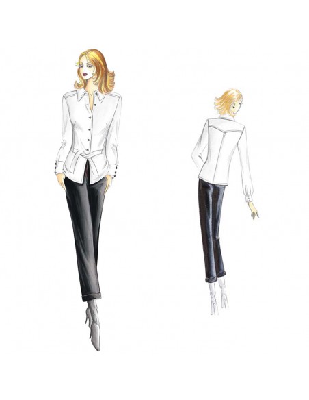 This somewhat form-fitting shirt-like blouse has an inserted fabric belt to mark the waistline. Mini coat no. 9609.