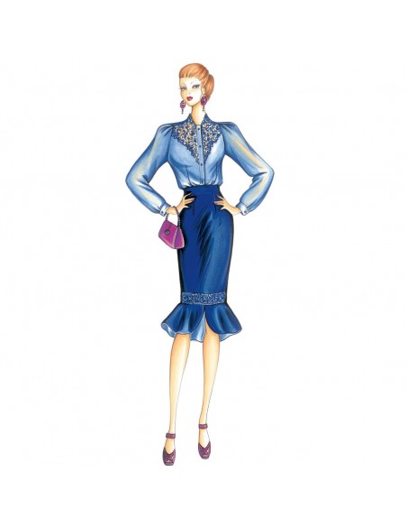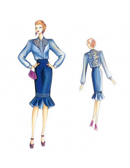 Camiseta con canesú y parte de detrás en encaje, cuello realzado, mangas de corte semi-ranglan y pequeños pliegues abolsados, para realizar en organdí o chifón. Falda n. 3115.