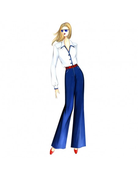 Camiseta realizable en seda o chifón con cuello a puntas alargadas, cuarto trasero con leve fruncido y mangas largas fruncidas en los puños. Pantalones n. 7124.