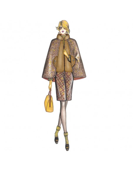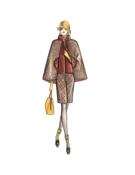 Capa, se abrocha con zip, cuello vuelto y solapas tipo media luna, ribeteadas y presas con botón. Tejido recomendable: tweed y vicuña de un solo color, para crear un efecto chaleco o bien enteramente en lana tratada, punto doble, bouclé.