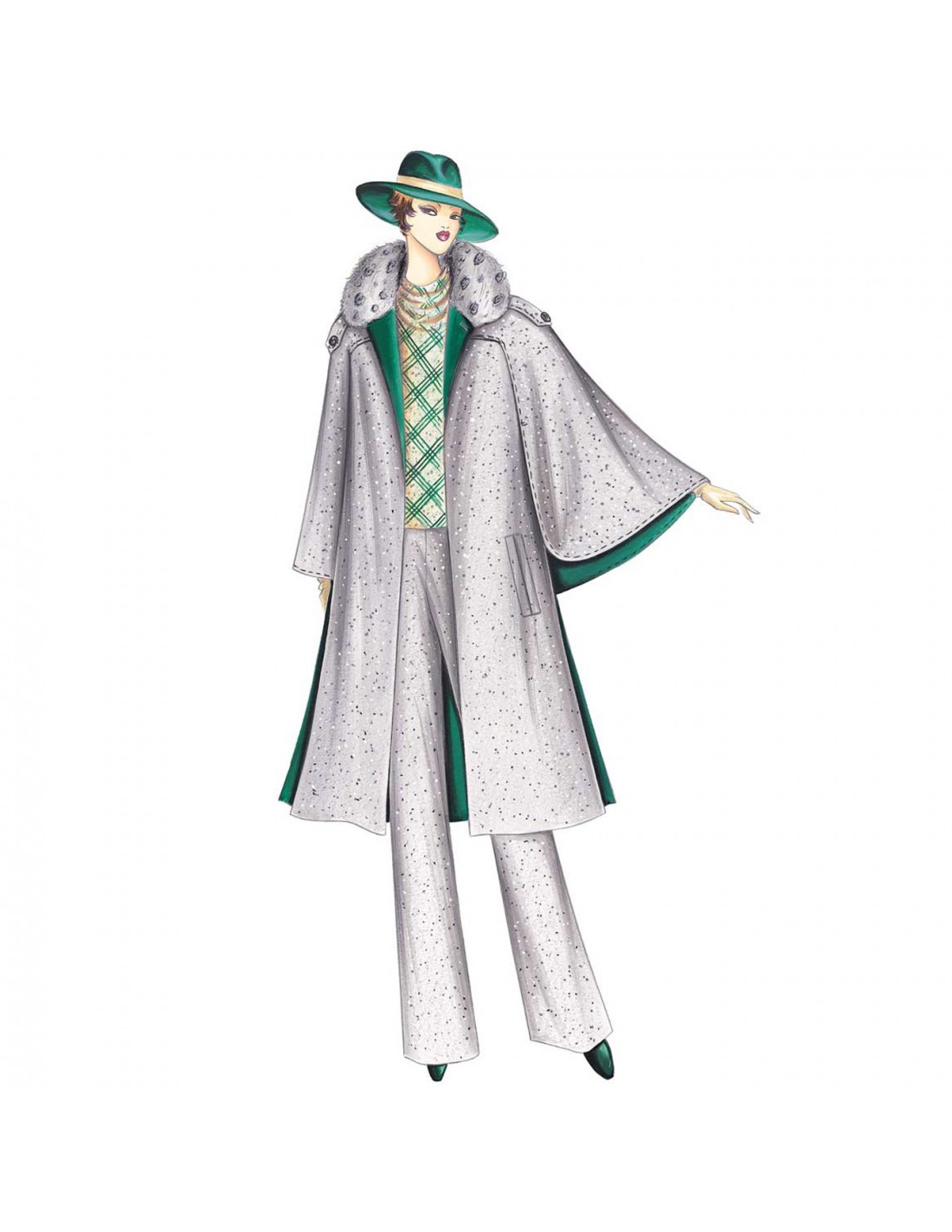 Capa de una fila de botones, alargada, se puede realizar en tweed o tejido double-face con aberturas laterales, cuello de piel y manga amplia martillo transformable en capa.