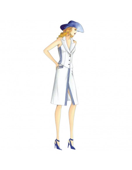 Chaleco con vuelta de manga entrante, cuello de solapas tipo lanza y ribete azul oscuro en tejido de lino o de gabardina de algodón.