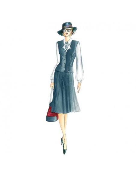 Chaleco recto, se puede hacer en jersey o vicuña, escote con pequeñas aberturas en forma de V y bolsillos aplicados en la parte inferior.