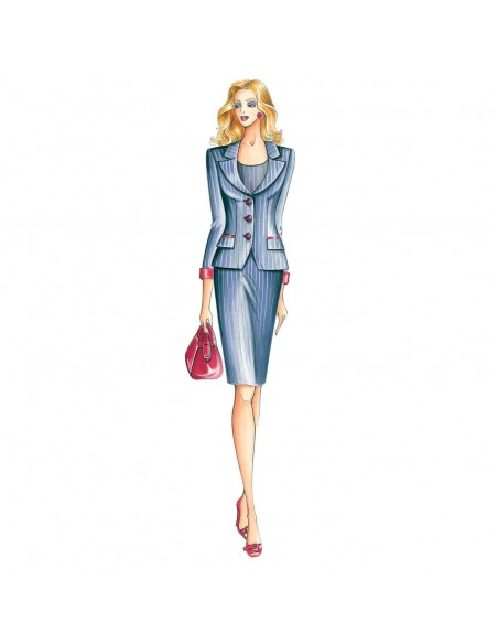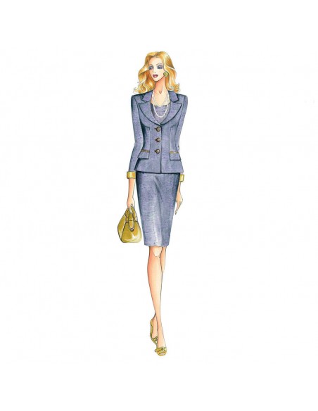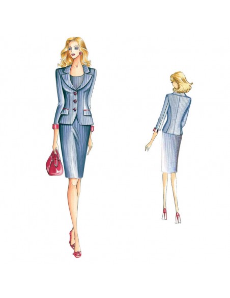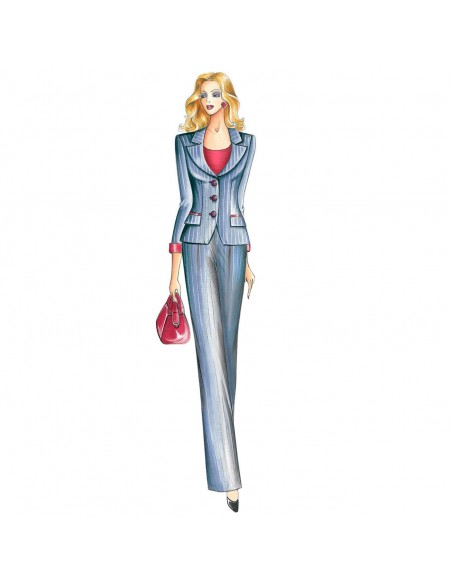 Chaqueta corta y modelada, de solapas aplicadas en el escote redondeado en tejido bies. Vestidito n. 5015. Pantalones n. 5217.