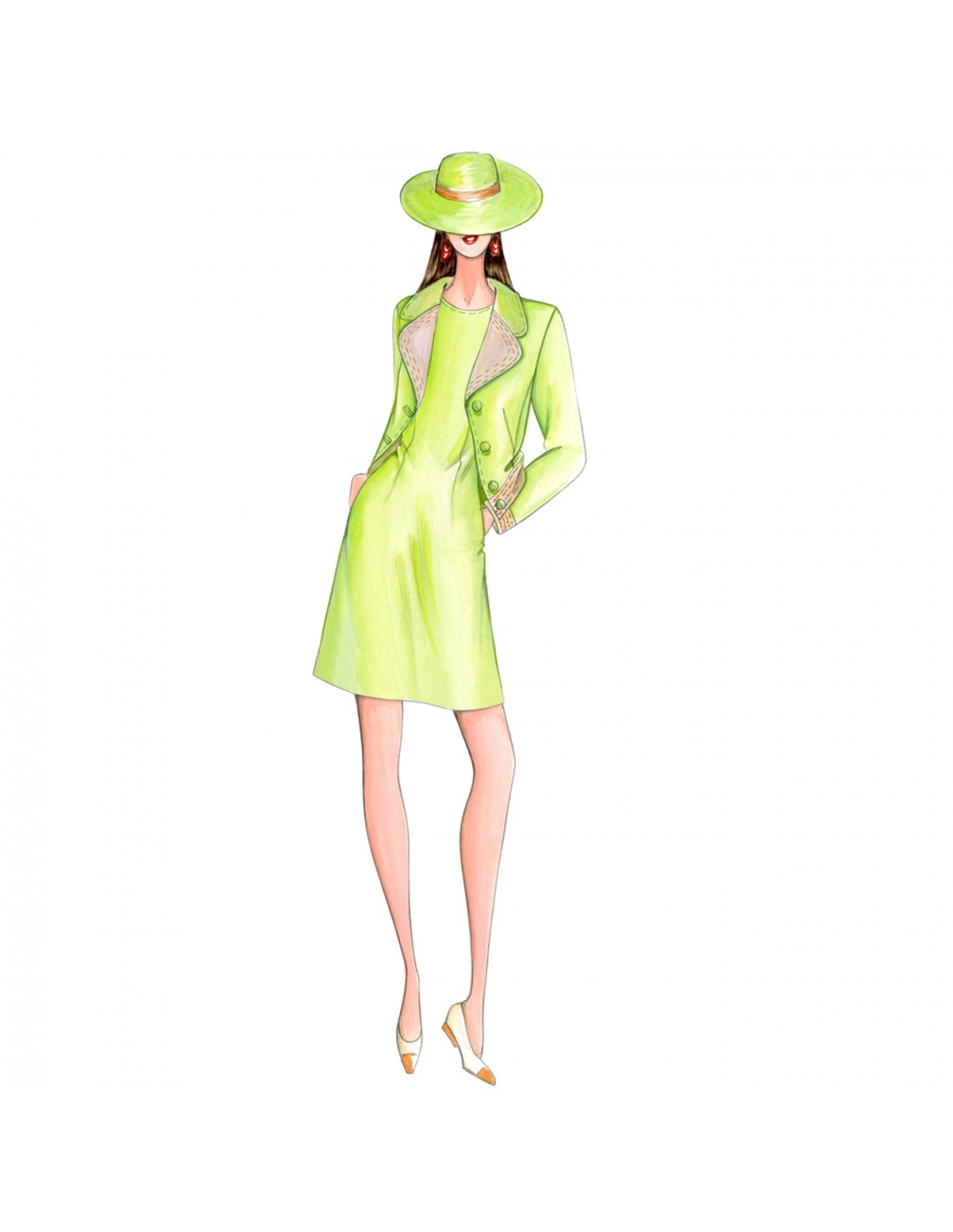 Esta chaqueta de botonadura sencilla en tejido de doble faz con cuello redondo ancho y cintura está cubierta de pespuntes. Vestido n. 7171.