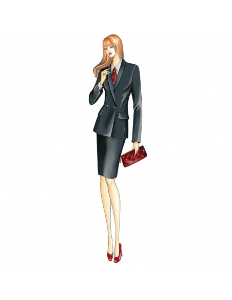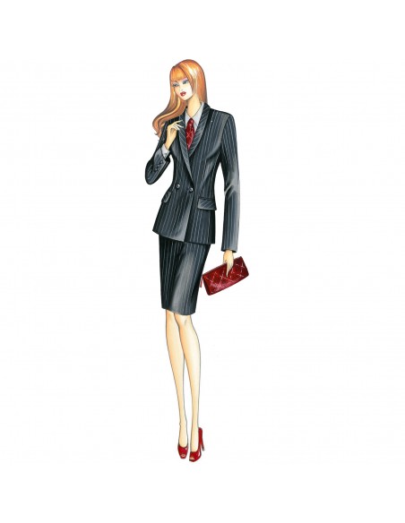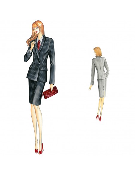 Chaqueta modelada de doble fila de botones, aunque sólo se abrocha con dos, cuello pequeño y cruzado, bolsillos interiores de solapa. Se puede hacer en tejido de rayas, sallia, pana lisa o en adamascado.