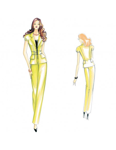 Chaquetilla ajustada bord-a-bord, se abrocha con zip, cuello deportivo, cinturón alto aplicado, faldellín de dos niveles aplicado a los cortes tipo redingote por detrás, las mangas cortas kimono se abrochan tipo globo. Se puede hacer en sallia, denim ligero, lino.