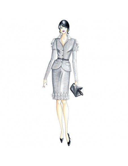 Chaquetilla de una sola fila de botones, modelada, cadera marcada por faldellín redondeado, las mangas originales forman volante sobre los hombros. Se puede hacer en punto, príncipe de gales, grisalla, lana fría.
