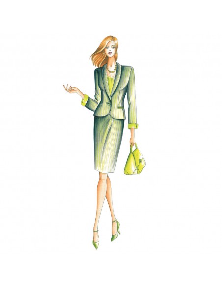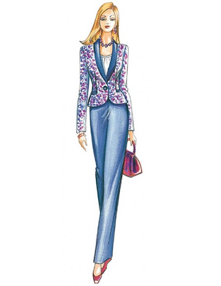 Chaqueta pequeña, corta y modelada, para hacer en tejido de rayas o de fantasía, con una sola fila de botones presa de un solo botón y cuello cruzado de raso o del mismo tejido.
