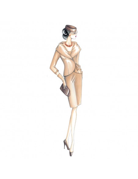Chaquetilla ajustada de doble cruce abrochada con cinta, el cuello ancho y cruzado se mantiene ligeramente desestructurado, mangas de vuelta ¾. Se puede hacer en organdí, tafetán, gasa de seda, seda moaré, raso.