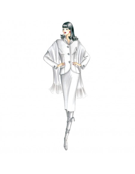 Chaqueta de una sola fila de botones, modelada y redondeada en la parte inferior, cuello alto cruzado ligeramente drapeado, se puede hacer en terciopelo, mangas kimono con sobaquera. Tejidos recomendados: lana fría, crespón, franela.