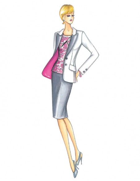 Chaqueta clásica, de una sola fila de botones, modelada, cuello de solapas tipo lanza y bolsillos internos de solapa. Se puede hacer en crespón, lana fría, tasmania, tejido de rayas.