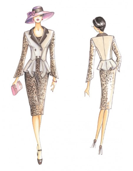 Chaqueta juvenil en crespón de doble cruce, con faldellín original suelto tipo pañuelo, cuello de raso y mangas acampanadas de encaje macramé.