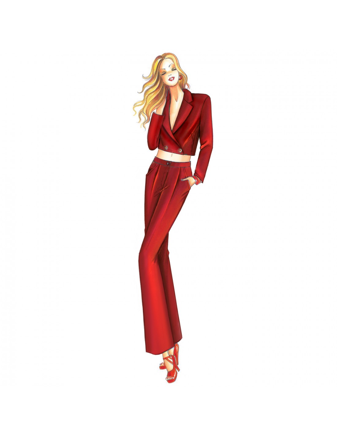 Chaqueta semientallada de doble botonadura con cuello deportivo. Tejidos recomendados: popelín, lana fría, satén.