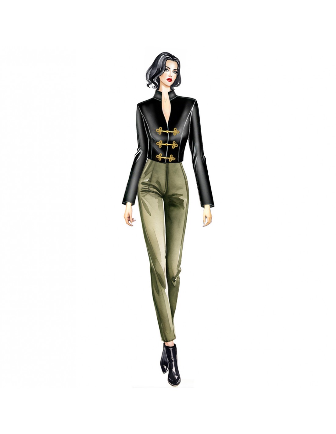 Chaqueta corta de estilo napoleónico que se puede confeccionar en piel sintética, terciopelo o denim, con cuello de banda y cierre con alamares.