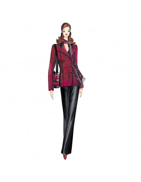 Se puede realizar en tweed o tejido gabardina una chaqueta de corte semi-modelado, cruzada y con dos filas de botones que bajan para formar una sola fila, bolsillos que se cierran con cremallera, sobrecuello de piel y trabilla trasera.